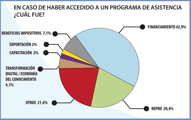 También se valoran los programas de apoyo estatal, aunque sigue siendo alto el porcentaje de empresas que no pueden acceder (más del 60%). La mayoría de las que obtienen apoyo requiere líneas de financiamiento, seguido por la asistencia del Repro. Se aprecian también los beneficios impositivos, de vinculación tecnológica y economía del conocimiento, así como el apoyo a la exportación y la capacitación.
