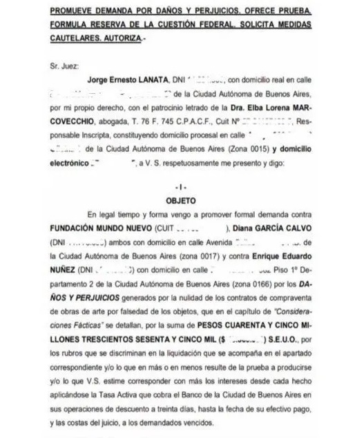 A la vez, en el programa mostraron el documento de la causa en contra de la Fundación Mundo Nuevo, que es la galería que vendió las obras de arte. La demanda nombra a Diana García Calvo, dueña del lugar, y a Enrique Eduardo Nuñez, quien era el antiguo propietario de las pinturas.