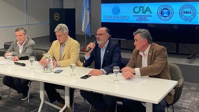 El anuncio fue realizado por los presidentes de Sociedad Rural Argentina (SRA), Nicolás Pino; de Confederaciones Rurales Argentinas (CRA), Jorge Chemes; de Federación Agraria (FAA), Carlos Achetoni; y el vicepresidente de Coninagro, Elbio Laucirica.