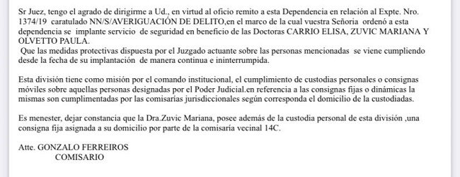 Que “… vuestra Señoria ordenó a esta dependencia se implante servicio de seguridad en beneficio de las Doctoras @elisacarrio @MarianaZuvic y @pau_oliveto”, el que “se viene cumpliendo desde la fecha de su implantación de manera continua e ininterrumpida…” y dale que va. pic.twitter.com/EJiwpFJj7E