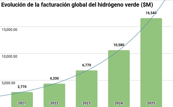 La demanda global de hidrógeno verde se prevé que alcance un 17,87% en 2025, y hasta un 61% en 2050. La facturación global del sector del hidrógeno verde se estima en 16.540 millones de dólares en 2025, creciendo a un ritmo del 56,3% anual. Se estima que para 2050 se utilice en sectores como el de la construcción, la movilidad, la industria química y como generador de calor y luz.