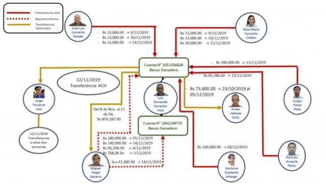 “Una pequeña parte del financiamiento” del golpe de Estado de 2019 fue revelado y llegó a unos Bs 2,1 millones, dinero que fue movilizado hacia y desde la cuenta bancaria del excívico Fernando Camacho. Su padre, José Luis Camacho, y su hermana, Rosa María, junto a otras ocho personas de su círculo cercano, están involucrados en el flujo del dinero. El Gobierno ampliará la denuncia