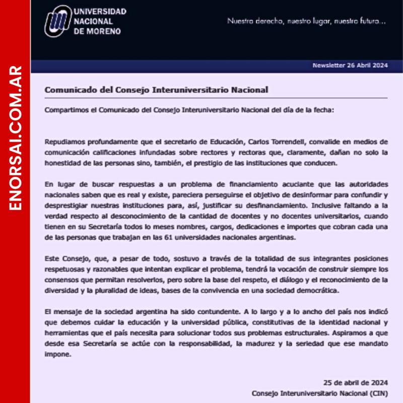 El Consejo Interuniversitario Nacional emite un comunicado enérgico repudiando las calificaciones infundadas del secretario de Educación, Carlos Torrendell, hacia rectores y rectoras de universidades argentinas. Se denuncia la intención de desinformar y desprestigiar a las instituciones académicas en lugar de abordar el problema real de financiamiento.