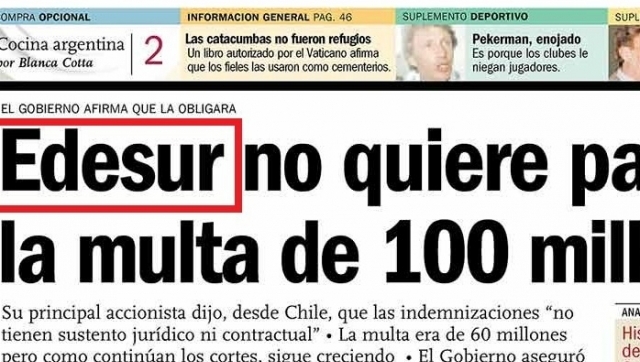 -"Edesur no quiere pagar la multa de 100 millones"; jueves 25 de febrero de 1999.