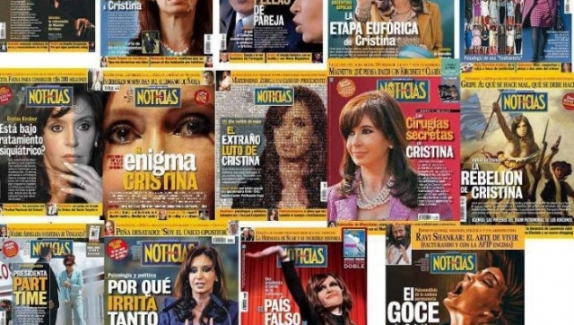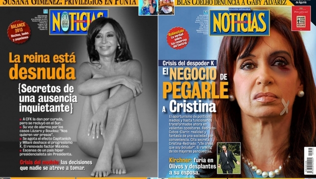 Así, la última tapa de Noticias, que muestra un exagerado primer plano del rostro de Susana Giménez acompañado de la leyenda “El shock de los setenta”, se inscribe en una larga saga de intervenciones de la revista sobre cuerpos de mujeres que cuentan con algún tipo de poder, con especial encomio con la figura de la Presidenta. “Intimidades del shock”, rezaba una tapa en que el rostro de Cristina aparecía intervenido al modo de un manual de anatomía, recortado en la zona de la tráquea para señalar la localización un carcinoma; “El goce”, titulaba otra, para retratar con la estética del animé a Cristina lanzando un gemido en una suerte de “orgasmo de poder”; “La reina está desnuda”, dice finalmente una tapa más reciente, en la que el rostro de Cristina es adherido al cuerpo desnudo de una modelo mediante la técnica del Photoshop. Todas estas tapas reconocen a su vez como antecedente aquella que caracterizaba a la presidenta como bipolar y trastornada.