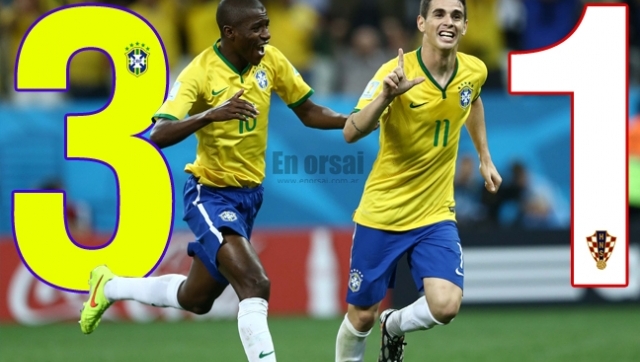 Neymar anotó a los 29 minutos del primer tiempo y a los 26 del complemento, de tiro penal, y Oscar puso cifras definitivas a los 45, mientras que Marcelo, en contra de su valla, había anotado la apertura del marcador para los croatas a los 11 de la etapa inicial del cotejo jugado en el estadio Arena Corinthians de San Pablo.