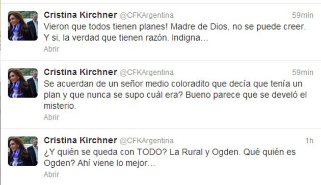 Cristina comenzó sus tuits llamando la atención a un artículo periodístico: ?No lo puedo creer. What? Leo Tiempo Argentino `Cierran causa por polo gastronómico en la Sra`. Y eso qué es? Les cuento: en 1999 el Bapro le presta $106 millones a la Sociedad Rural?.