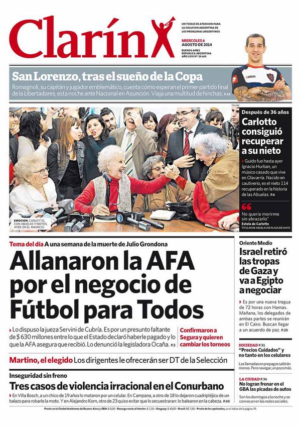 Además, en la portada en papel de la edición de hoy el titular preponderante es sobre el allanamiento a la AFA realizado en el mediodía de ayer, en letras tipo catástrofe, acompañado por una foto de la conferencia de prensa que ofreció Estela en la sede de Abuelas.