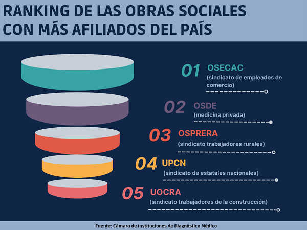 A su vez, hay que destacar que las 10 principales obras sociales concentran aproximadamente el 43% del total. Entre estas figuran: OSECAC, del sindicato de empleados de comercio; OSDE, medicina privada; OSPRERA, vinculada a trabajadores rurales; UPCN, del sindicato de estatales nacionales; UOCRA, que representa a trabajadores de la construcción; OSPE, orientada a petroleros; OSUTHGRA, para trabajadores gastronómicos y hoteleros; ASE, destinada al personal de dirección de empresas; Mutual Sancor, centrada en medicina privada; y UOM, del sindicato de trabajadores metalúrgicos.
