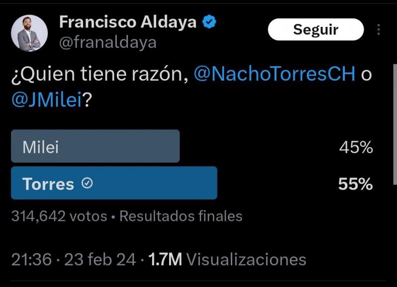 Milei compartió una encuesta en Twitter en la que había que decidir quién tenía razón entre él y Nacho Torres, el gobernador de Chubut, que inició un alzamiento de las provincias patagónicas luego de que el Gobierno frenara el envío de fondos por coparticipación.