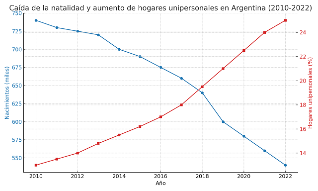 El nuevo mapa social argentino muestra un fenómeno creciente: los hogares sin hijos son ya mayoría, y los hogares unipersonales –es decir, de personas solas– pasaron de representar el 13% en 1991 al 25% en 2022. Uno de cada cuatro hogares en el país está habitado por una sola persona. Una radiografía que duele y que se profundiza con el envejecimiento poblacional y la migración de jóvenes.