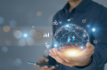 Un hombre sostiene una proyección holográfica de la Tierra que muestra el icono de la nube con flechas de datos bidireccionales, simbolizando la computación en la nube global y la conectividad.